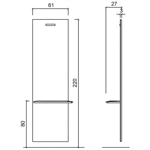 Зеркало парикмахерское "Eco" - прямоугольной формы. Зеркало оснащено алюминиевой столешницей оригинальной формы с отверстием для фена. Крепление к стене.
