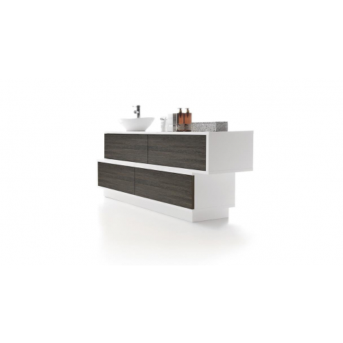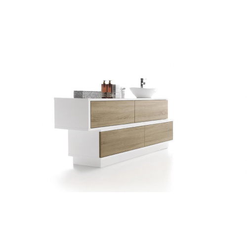 Это универсальный предмет мебели, который отлично впишется в любой интерьер. Модель выполнена из глянцевых меламиновых плит белого цвета. Выдвижные ящики изготовлены из натуральной древесины. Производитель предлагает несколько вариантов исполнения – натуральный венге, белая лиственница, дуб бардолино. Дополнительно мебель может комплектоваться раковиной со смесителем из хромированной стали. Ящики могут располагаться друг над другом или же быть смещенными относительно центра. Этот вариант мебели можно установить в любом СПА-салоне или салоне красоты.