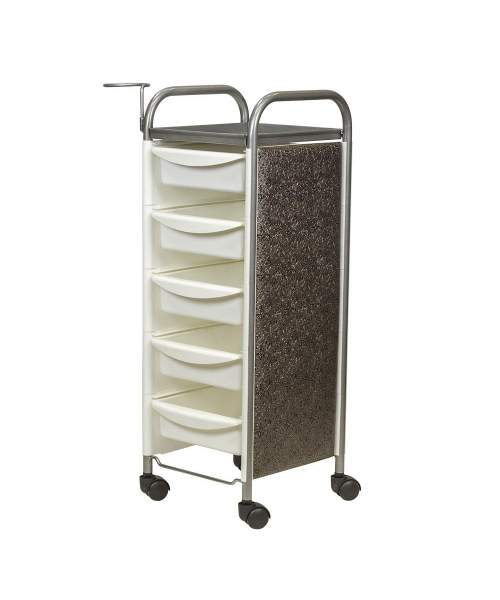 Для инструментов и расходных материалов в тележке предусмотрены пять съемных ящиков. На верхней полке можно разложить инструменты, используемые во время процедур. Для быстрого и удобного перемещения по кабинету конструкция установлена на маневренные колесики. Практичное дополнение парикмахерского оборудования – фенодержатель.