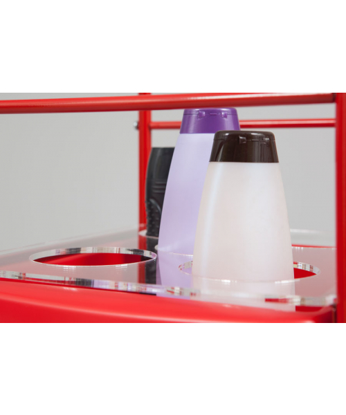 - Пластмассовая панель с отверстиями для емкостей легко снимается, и модель можно использовать как обычную парикмахерскую тележку.